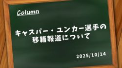 コラム キャスパー ユンカー選手の移籍報道について 最近、キャスパーユンカー選手の移籍報道がいくつかのメディアから報道されています。いちグランパスファンとしては、2023年から名古屋に在籍し、特に加入初年度にはリーグ戦16ゴールを挙げたユンカー選手がもし移籍してしまうとなると、寂しい限りです... 2025.10.14 コラム