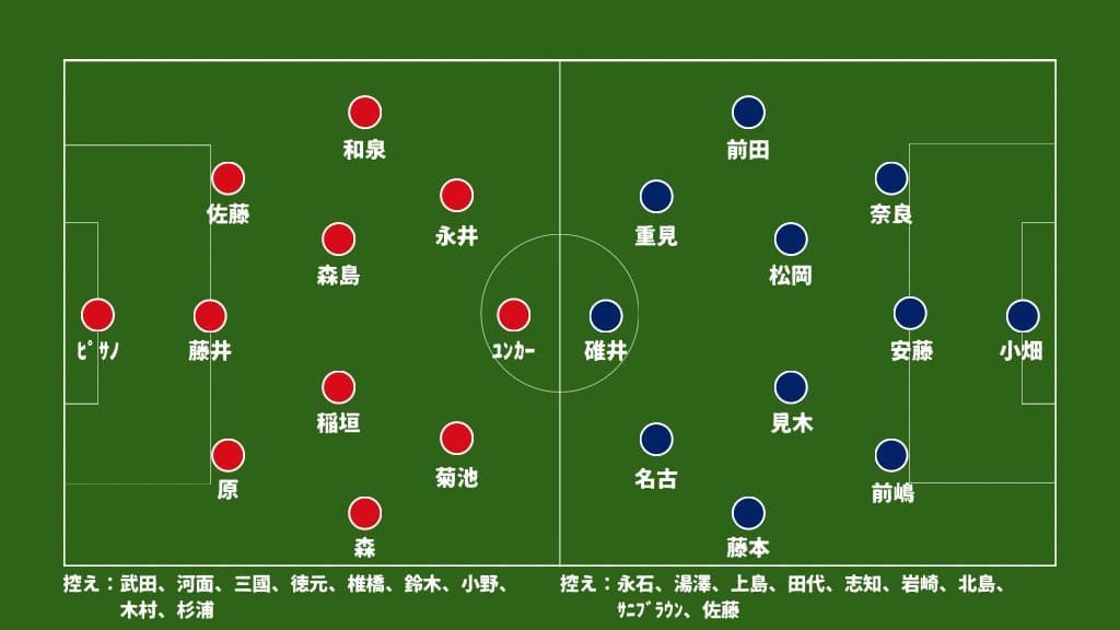 前節の町田戦とほぼ同じメンバーですが、変更点として、キーパーにはピサノを起用。武田は前の試合あまり良くなかったので妥当な選出と考えます。