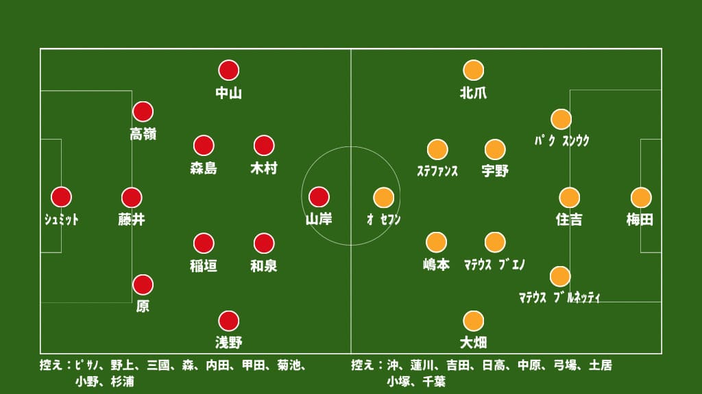 対する清水は前節から3枚を変更。怪我人が多く、中々ベストなスタメンが組めず苦しい台所事情になっている印象です。